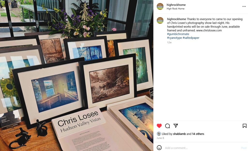High Rock Home in Catskill, NY, features artworks and home decor inspired by the natural beauty of the Hudson Valley. This show presents landscapes from the region, printed in gum dichromate, cyanotype and salted paper.